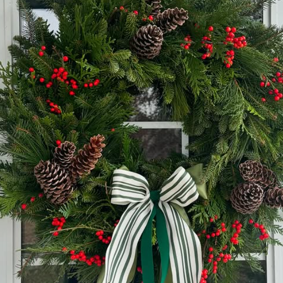 Welcome the season with a handcrafted fresh evergreen wreath or a festive centerpiece!